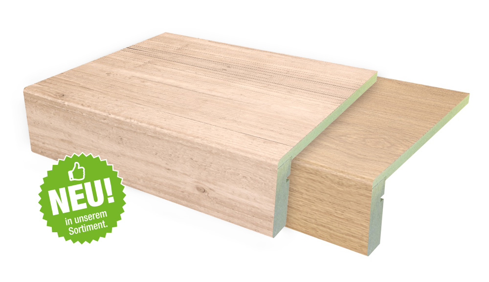 Ab sofort ergänzen unsere neuen Laminat-Dekore "Eiche Natur" und "Pinie Rustic" unser Stufen-Portfolio für die Treppenrenovierung.